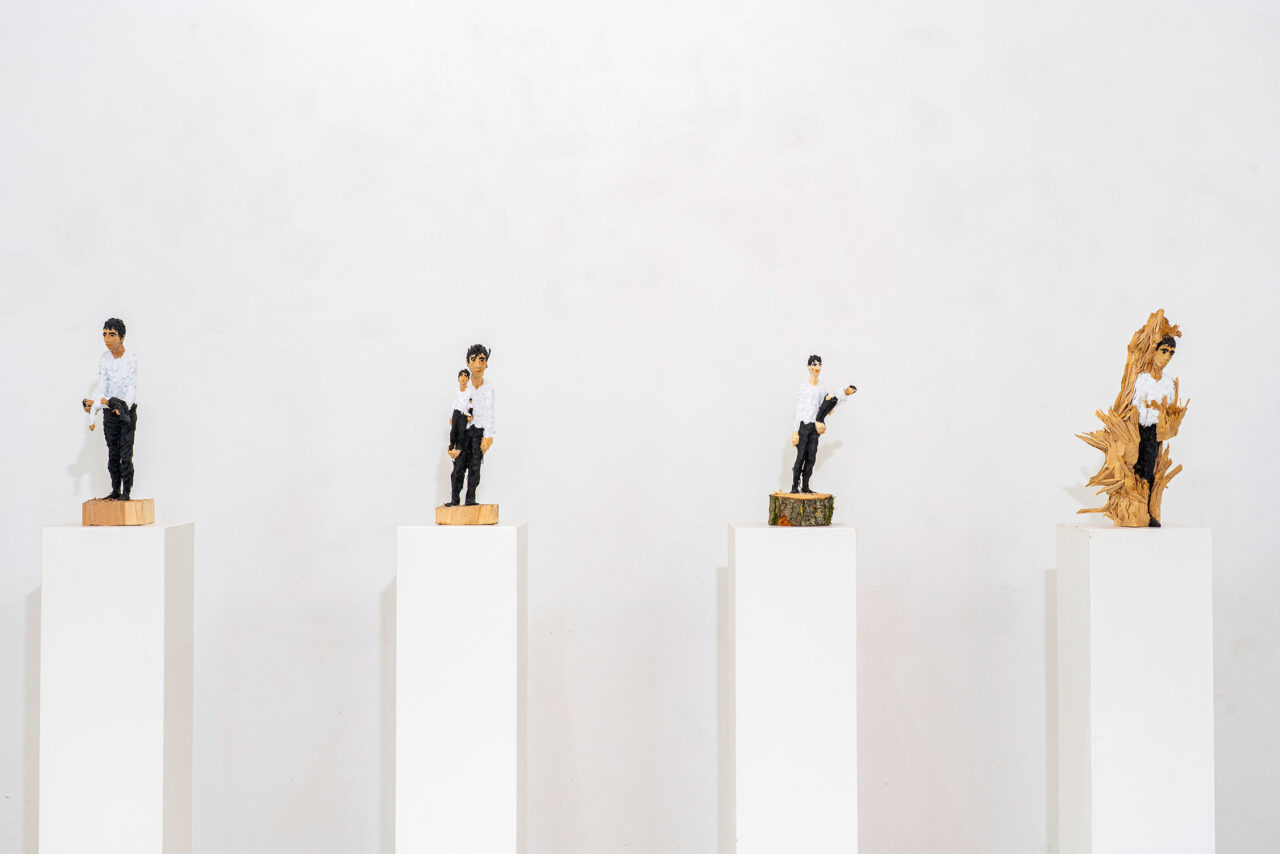 Grob bearbeitete Holzskulpturen zeigen „Metamorphosen“ zwischen Mensch und Natur. Grenzerkundungen mit dem Material und der menschlichen Figur.